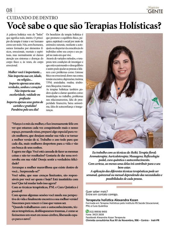 HÁ SETE ANOS TRABALHO COM AS TERAPIAS HOLISTICAS INDIVIDUAIS E EM GRUPOS, JÁ TRANSFORMEI A VIDA DE CENTENAS DE MULHERES QUE SE ENCONTRAVAM PERDIDAS DENTRO DE SI MESMA, COM ANSIEDADE, MEDOS, TRAUMAS DO PASSADO, ETC... IDENTIFICO AS CAUSAS, TRABALHO COM A AUTO CURA E JUNTAS, DESPERTAMOS SUA MELHOR VERSÃO .