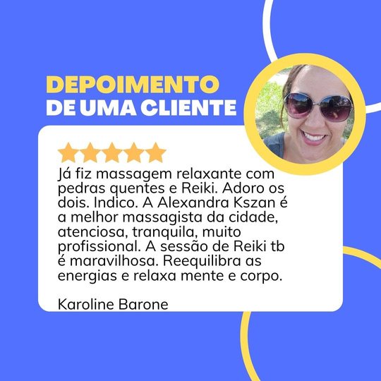 Eu faço massagem com pedras quentes semanalmente, e não fico mais sem! Sou Diretora Administrativa estou no ramo de Engenharia Elétrica Industrial, e como tal, tenho muitas responsabilidades e compromissos que não são fáceis enfim faz parte, então as dores no corpo apareceram, a 7 anos descobri que tenho fibromialgia. E é aí que Alexandra Kszan me ajuda, com a massagem minha qualidade de vida melhorou muito, não sinto mais as dores que antes tanto me incomodavam! Além do relaxamento que me proporciona! Eu costumo dizer que é um carinho para comigo! É um momento em que me permito relaxar, descansar. Eu estava tão ruim de stress que tinha uma dor nas costas que não passava com pomadas nem remédios! Aí me indicaram a Alexandra, mãos abençoadas e palavras de conforto além da experiência em detectar como os problemas refletem em nosso corpo! Não fico mais sem massagem! Super indico e recomendo! Fernanda Martins